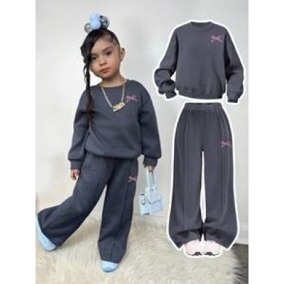 Baby Girls Casual Heart Print Knit Solid Color Loose Drop Shoulder Long Sleeve Sweatshirt And Wide Leg